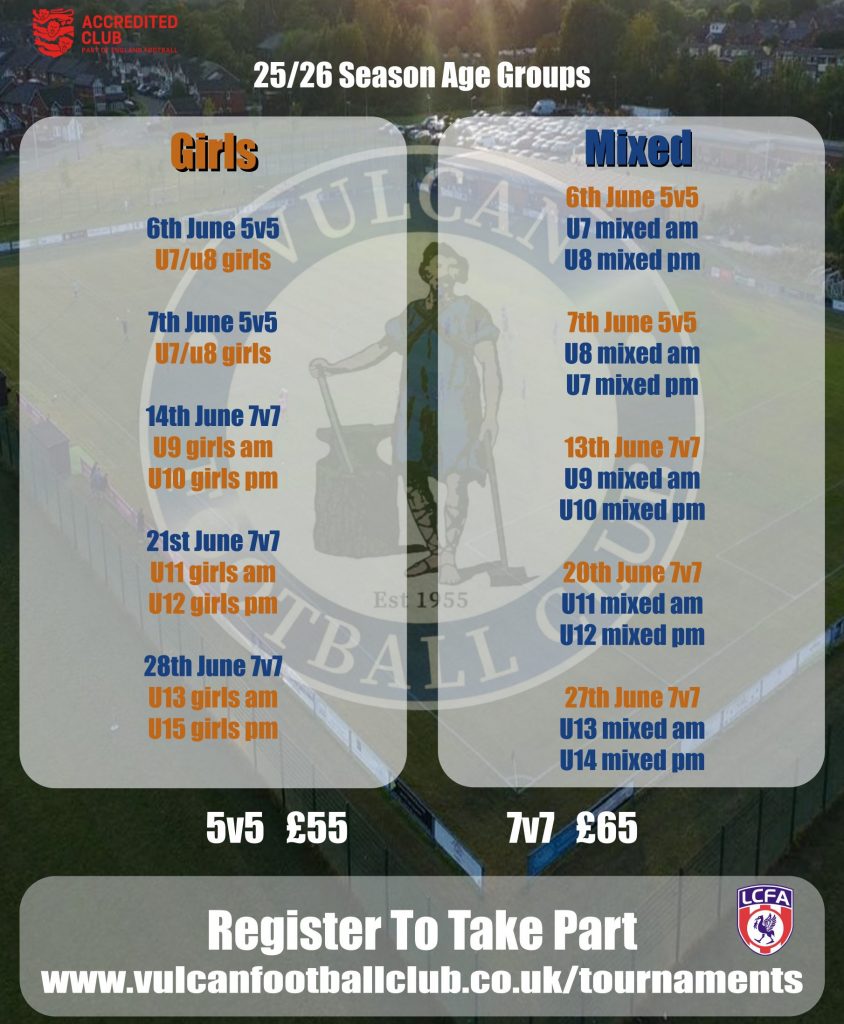 Vulcan Football Club look forward to welcoming you to our end of season tournament which will be held at our Home club; Vulcan Sports Club.