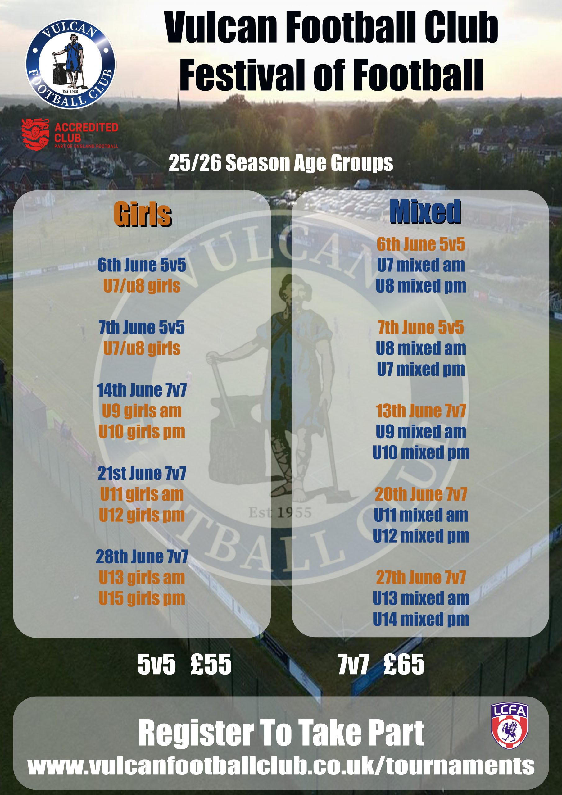Vulcan Football Club look forward to welcoming you to our end of season tournament which will be held at our Home club; Vulcan Sports Club.